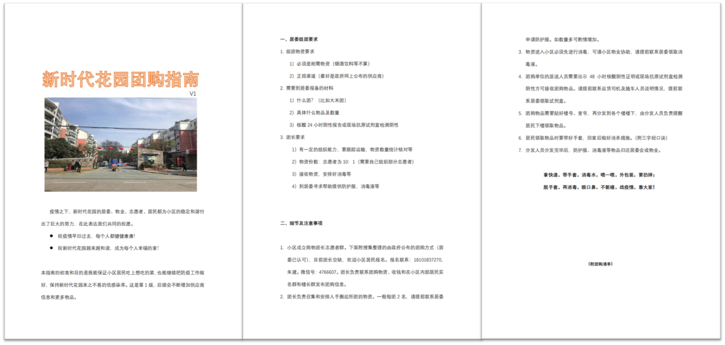 基于课题组的前期成果,朱建教授以一位学者的严谨态度连夜编写了一份长达22页的《新时代花园团购指南》,在征得居委会的同意后,将其第一时间发布在了小区业主群。据悉,发布当天就成团4个,服务上千人次,涵盖蔬菜、肉、鸡蛋、海鲜等物资。参与团购的住户们纷纷对朱建教授表达了真挚的感谢,并请他一定要把这份感谢也转达给上师大的研究生们。“科研的价值在于服务社会,此次组织研究生们围绕社会之难和居民所需做些力所能及的事情,也是希望能引导他们不忘科研初心、增强服务意识。”朱建教授如是说。