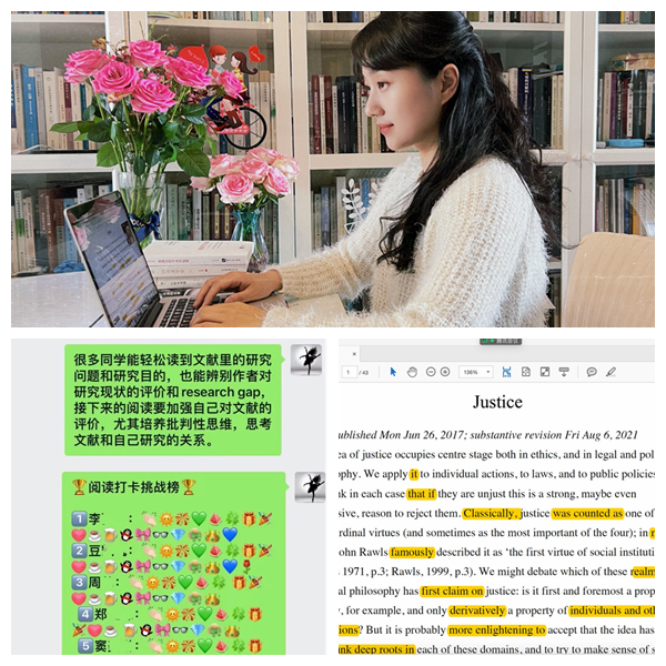 20级政治学理论专业学生窦美霖说:疫情增加了距离,但不阻碍知识的传递和学习的步伐。本学期陈老师的专业英语课程虽然转为线上授课,但是陈老师每次课程的内容安排十分丰富,线上授课也能与同学们频繁互动、问答紧凑。课后陈老师组织同学们进行线上英语学术阅读打卡,每天都会批阅阅读反馈,并就同学们提出的问题做出解答,分阶段给出相应的引导;此外,陈老师还用表情图像为同学们制作“英语阅读打卡挑战榜”,激发同学们阅读热情的同时也给到了鼓励。在老师和同学的互动中,线上授课同样收获颇丰。