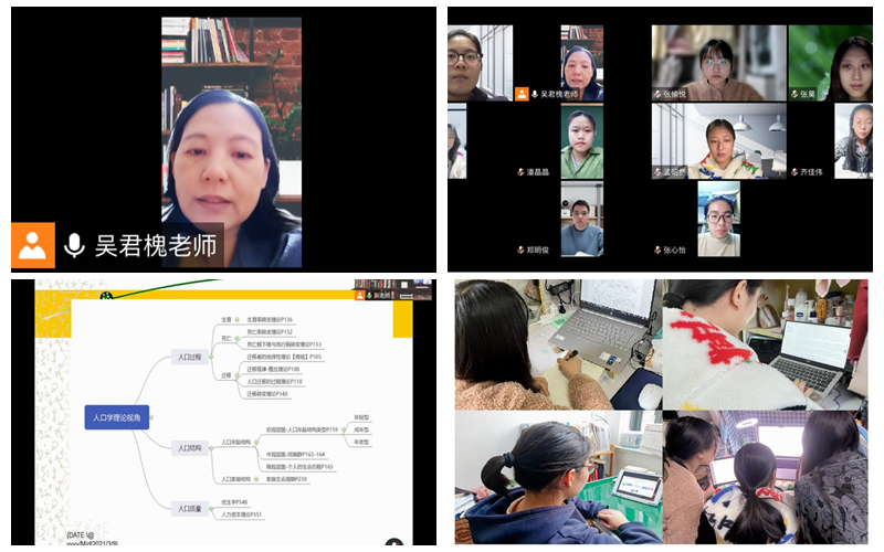 “一个不能少”是吴君槐老师始终如一的坚持。上网课之前,吴君槐老师会提前半小时在微信通知同学们,腾讯会议课前再通知,确保每一位同学都知晓课程时间安排。若有特殊状况,班长也会协助老师通知到每一位同学。在上网课的过程中,吴君槐老师会合理安排课程内容,采用多元化教学手段,以“网课+在线提问+分组作业+复述重点+系统讲解视频+案例+探讨”的形式进行线上教学,由她主讲基本原理与基本理论,同学们积极参与线上讨论。吴君槐老师一直倡导同学们进行研究式学习,采用小组合作的方式,围绕养老、医疗等主题,结合生活实际进行研究,收集和分析数据,提高学生们的科研能力和学术素养。课后为了教会同学们自主学习,吴老师会推荐阅读书目、相关案例、影片和论文补充学习,以巩固学习成效。
