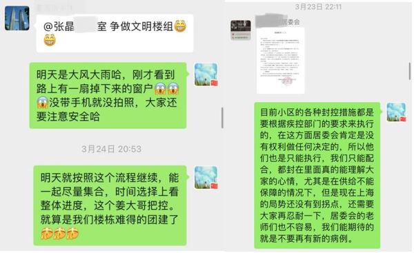 机关继续教育学院党支部书记张晶是小区的楼组长,在小区封控管理期间,她通过多种途径和方式与楼组居民沟通,及时传达居委各项安排,收集统计信息,关心疏导居民不良情绪与积极引导。她认为,在无数令人泪目的“逆行者”中,她所做的是微不足道的小事。疫情当前,责任在肩,相信只要大家各尽一份力,共担一份责,就一定能够早日驱散疫情阴霾。