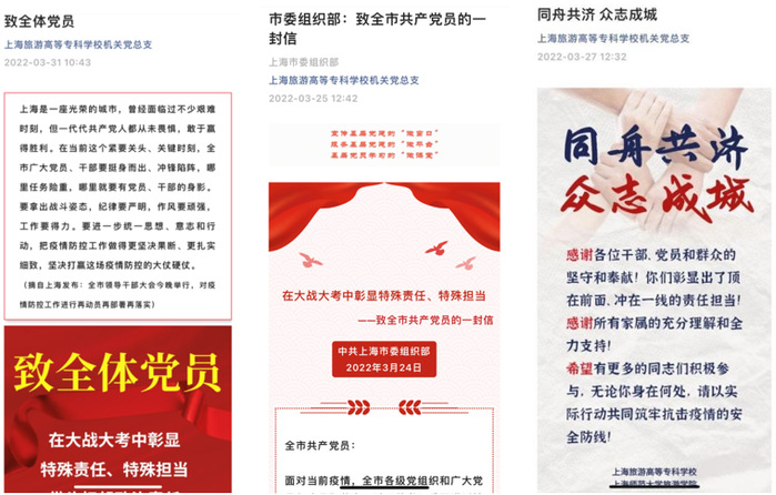 4月6日晚,中共上海市委发布《致全市共产党员的公开信》,号召上海市广大共产党员,紧急行动起来,尽锐出战、持续奋战,全力投身到这场严肃的抗疫斗争中去。旅游学院(旅专)机关党总支认真落实“双报到”工作要求,倡议全体党员和干部就近就地参与疫情防控相关工作,带头亮明党员身份,积极展现了机关党员和干部的担当作为。