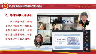 专题组织生活会上,党员们还交流了开展线上教育教学、实施全员导师和党员社区志愿者服务的情况。一个党员一面旗,在抗疫工作的严峻时刻,党员教师以身作则,率先垂范,以实际行动经受考验,为党旗增光添彩。