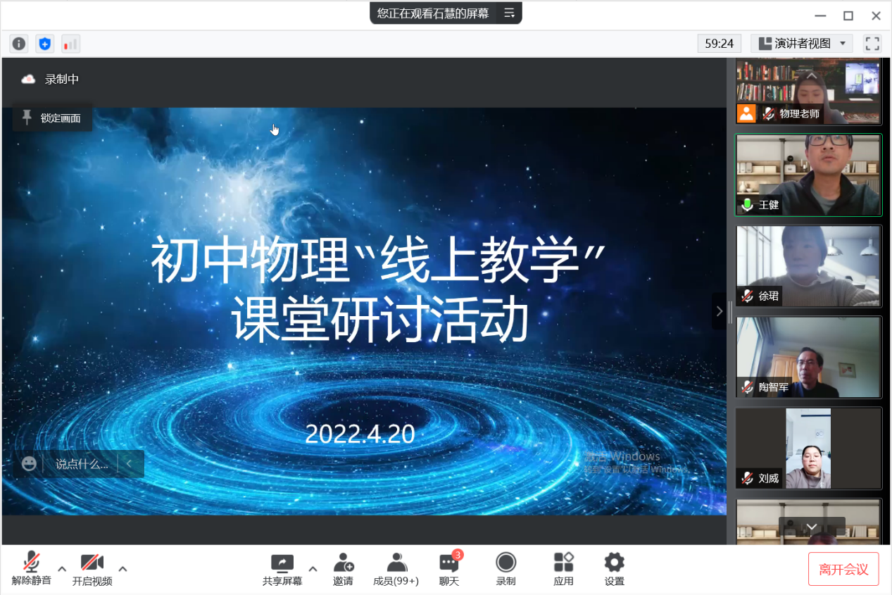 4月20日下午,数理学院组织2019级和2020级物理学(师范世承)班的同学观摩学习了由松江区举办的主题为“初中物理在线教学课堂研讨活动”教育见习活动,活动主持人为松江区物理教研员王健老师。本次活动主要包括了中学物理线上教学课堂与研讨两个部分,活动采用线上直播教研的方式进行。同学们不论是居家隔离还是留校隔离都克服了种种困难,准时参加了本次特殊又有意义的教育见习活动。
