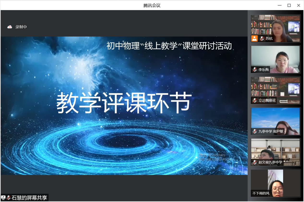 首先,师生们旁听了由上海对外经贸大学附属松江实验学校花园分校的苏杭老师为八年级同学们讲授的线上物理课——4.2机械功率。虽然苏老师只有三年的教龄,但她对课程的把握,对学情的分析和对信息技术的应用都非常值得学习。苏老师以有趣生动的动画特效和图文并茂的PPT为载体,结合腾讯会议及小鹅云课插件功能加以辅助,既在最大程度上发挥了线上教学的优势,又解决了可能存在的教学效率问题,为我们呈现了一堂非常精彩的线上物理课。在本节课中,苏老师强调学生的主动参与,从引入开始就让学生在贴近生活的生动情景中主动学习,自主思考。通过平台将抢答、选择和用弹幕发送答案贯穿整节课中,以获得及时的反馈,加强了线上课堂的互动性和实时监测能力,这样新颖的设计让在座的老师和师范生都得到了很好的启发。在课程中,苏老师还十分注重思政教育和物理学史,能让学生在理论学习的同时增强民族自豪感和对科学的崇敬感。