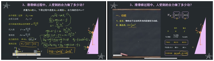 娄文豪:杜老师用滑梯来引入,引导学生回忆影响动能大小的因素,然后通过定量计算发现力做功与动能变化的关系,层层递进,导入过程生动有趣,最后又回到滑梯问题估算动能的增加,类似于原始物理问题,从建模到赋值,极大的锻炼了学生的能力,首尾呼应,让我们有了很大的收获。