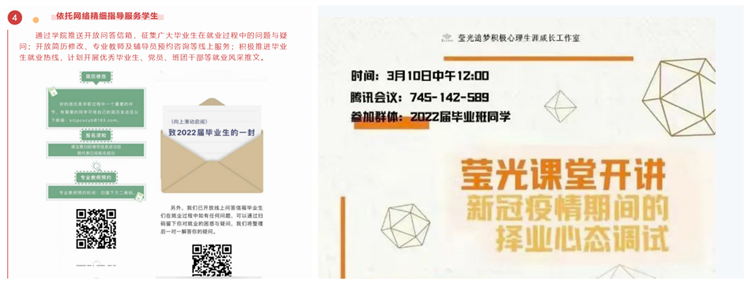 强化就业育人功能。关口前移,学院通过就业宣讲会、就业主题班会、职业礼仪演讲比赛、简历与面试技巧讲座、模拟求职比赛、国防教育动员等多条线不同形式的活动,充盈就业创业教育月内涵,强化毕业生就业意识、树立正确的就业观,引导毕业生探寻不同发展方向。学院通过网络平台及时推送就业招聘信息、线上讲座、经验分享交流会,一对一就业咨询等多种形式,内容涵盖了生涯规划、职业抉择、简历制作、求职面试、职业世界探索、求职心理调适、职前适应等,在疫情期间有针对性地帮助学生调整就业心态,提高就业能力。