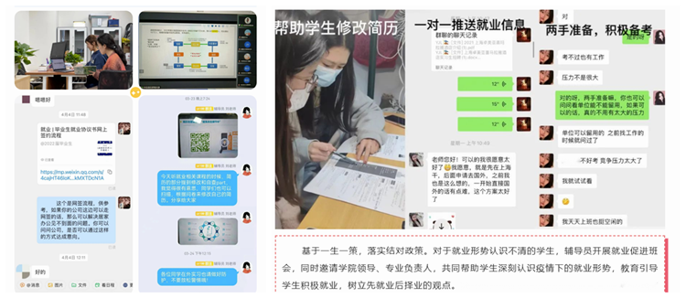 摸清底数,指导服务到位。辅导员动态掌握每一位学生的求职意向和就业进展,分类施策,努力做到学生动向及时掌握、学生需求及时了解、学生困难及时解决。毕业班辅导员充分利用微信、QQ、就业信息网站等网络平台,及时保证招聘、政策和相关讲座的信息通达。