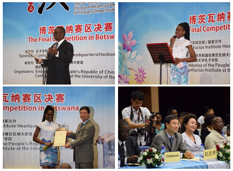 此次决赛经过中华文化知识笔试、汉语演讲和才艺展示三个环节的比拼,最终,吴德洛(Kutlo Omaatla Mochawacha)在比赛中脱颖而出,成为今晚的特等奖获得者,将于7月份代表博茨瓦纳大学生去中国参加全球总决赛。吴德洛是博茨瓦纳大学中文专业的学生,她演唱的中文歌曲《月亮代表我的心》,普通话发音标准、歌声优美动听且极具舞台表现力,引得观众欢呼不断,在场华人也情不自禁一起哼唱,气氛热烈而欢畅。博茨瓦纳国际科技大学地质工程专业的学生王菲(Phetso Sabata Tshabango)凭借精彩的演讲和一首《朋友》赢得观众好评,获得比赛的一等奖,赢得了去中国观摩比赛的资格。