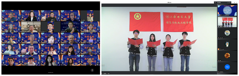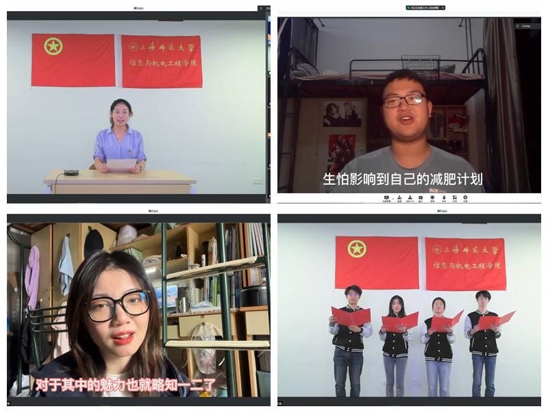 2021级学生邓鑫涛和冯可为大家带来了学院“成长·欢笑”脱口秀视频大赛中的优秀作品,展现了同学们在学校封闭管理期间排解烦恼、克服困难、积极向上精神面貌,也给整个直播间也带来了欢乐。学院2019级本科生洪宸、2020级本科生张晨浩、赵峻迎、赵卓涵的情景朗诵之李大钊的《青春》(节选),表达了信机学子对共青团百岁生日的真挚祝福。四位同学激情澎湃的朗诵感染了参会师生们,也彰显着信机学子不忘历史、心系天下的家国情怀。