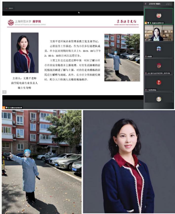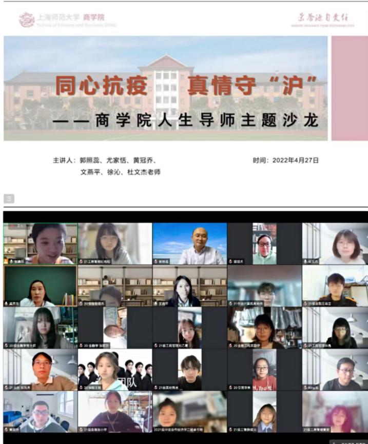 4月27日下午,商学院人生导师沙龙通过线上腾讯会议举行。学院分别邀请了郭照蕊、尤家恬、黄冠乔、文燕平、徐沁及杜文杰等6位老师为本次活动的主讲人,以《同心抗疫,真情守“沪”》为题为全院学生讲述自己的抗疫经历与感悟,给同学们上了一堂生动的抗疫大思政课,更好地激发了同学们成为抗疫主体的责任人。