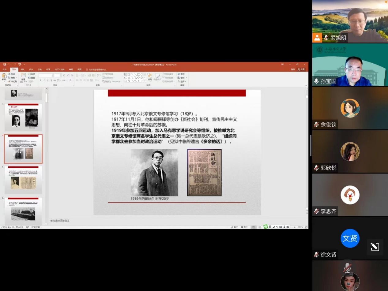 5月4日下午,在建团百年之际的五四青年节当天,影视传媒学院“广电读书会”举办人物研究专场,我校新闻传播学学科带头人孙宝国教授在线讲解了自己关于瞿秋白新闻活动的前沿研究,介绍了瞿秋白的革命历程和与新闻事业紧密相关的亲友。瞿秋白同志是中国共产党早期新闻事业的缔造者,讲座后有同学表示很高兴能在青年节上接受红色精神的熏陶。正是“不惮霜露续坎坷红章,百年回首励今朝青年”。
