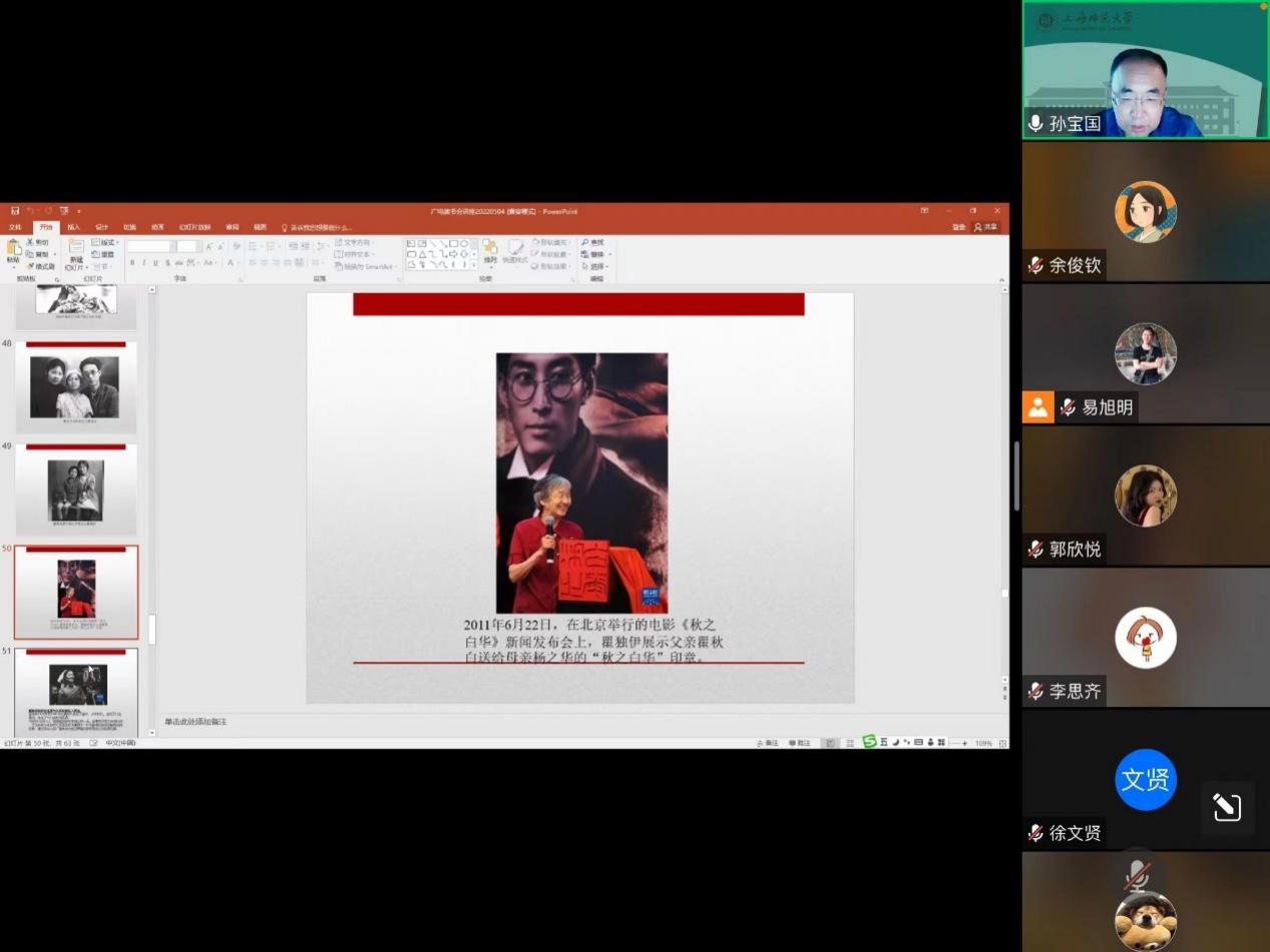 读书会还通过对瞿秋白亲友相关活动的梳理展现了瞿秋白同志的身后追思。孙宝国教授表示,不论是瞿秋白逝世后鲁迅先生对他的纪念,还是瞿秋白之女瞿独伊的相关活动,都在瞿秋白就义多年后的今天为我们更深入地了解这位革命先烈、更客观地认识他和他所处时代提供了重要帮助。孙老师总结道,“将历史与现实,过去与现在相结合,我们就能看到那些历史上的人物也都是活生生的人,是和我们一样的人。”