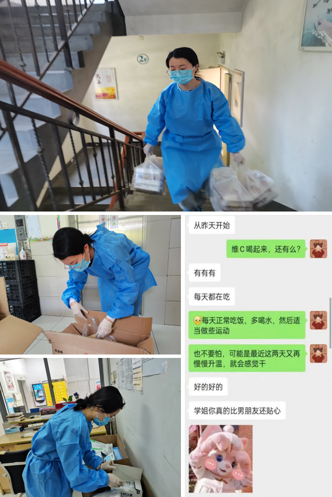 徐润浇老师是环地学院研三的毕业生,是大家的学姐,但同学们更喜欢喊她“徐妈”。她是学院的一名兼职辅导员老师,还是西八的住楼辅导员。闭环管理时,她协助另一位西八楼宇辅导员共同开展战“疫”工作,更强有力地守护西八宿舍楼的安全气囊。她走访学生宿舍,了解同学们的日常,当遇到学生骨折这样的突发事件时,她第一时间陪同就医,与骨折学生同隔离,照顾其日常。日常中,她能敏锐察觉学生们的心理变化,及时安抚情绪,时刻关心学生,缓解隔离学生紧张焦虑的心情,鼓励同学们保持良好心态,期待他们能够早日返回校园,隔离在外的学生亲切的感受到了徐老师的关爱,纷纷称徐老师比男朋友还贴心!而校内同学早已在每一顿徐润浇老师亲手送到宿舍门前的饭中感受到了温暖与幸福。