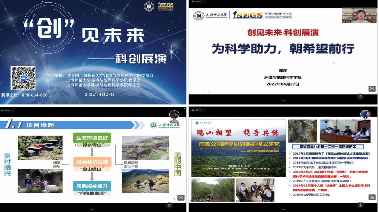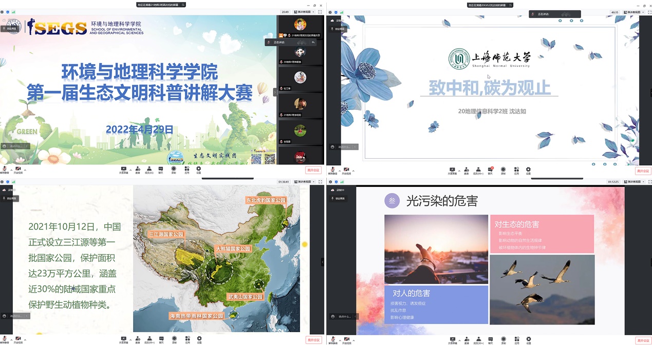 保护生态,人人有为。4月29日,生态文明科普讲解大赛以腾讯会议形式如期举行,大赛聚焦国家生态环境方面的热点议题,紧紧围绕绿色发展战略目标。参赛者们结合所学专业知识向大家介绍了碳排放、碳中和、光污染、国家公园、红树林等多方面的生态科普,阐释自身对生态文明理念的认识和思考。此外,大赛也邀请了上海市第八届科普讲解大赛奉贤赛区二等奖获得者周萱同学,为大家分享了她在上海市科普讲解大赛上的参赛心得和经验,针对题目切入点和讲解结束语等几个方面,为我们进行了现场展示和讲解。活动最后,院党委副书记张红老师对选手们的表现表示了肯定,并从“可听性”“知识性”“目标性”三方面与同学们分享讲解技巧,希望同学们通过科普讲解号召更多的人做生态文明建设的宣传者、倡导者和践行者。
