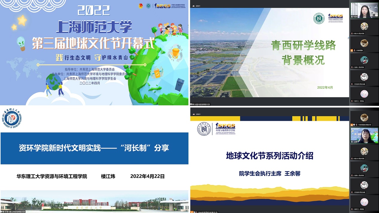 珍爱地球,守护绿色。4月22日下午,第三届地球文化节开幕式以线上腾讯会议方式成功举办,学院党委副书记张红老师、校团委副书记朱莹老师、华东理工大学资源与环境工程学院团委副书记曹悦老师、华东理工大学奉贤校区学生河长楼江炜、华东理工大学习近平生态文明思想研究会骨干、上海师范大学生态文明实践团以及院团委学生会全体成员出席了本次开幕式活动。