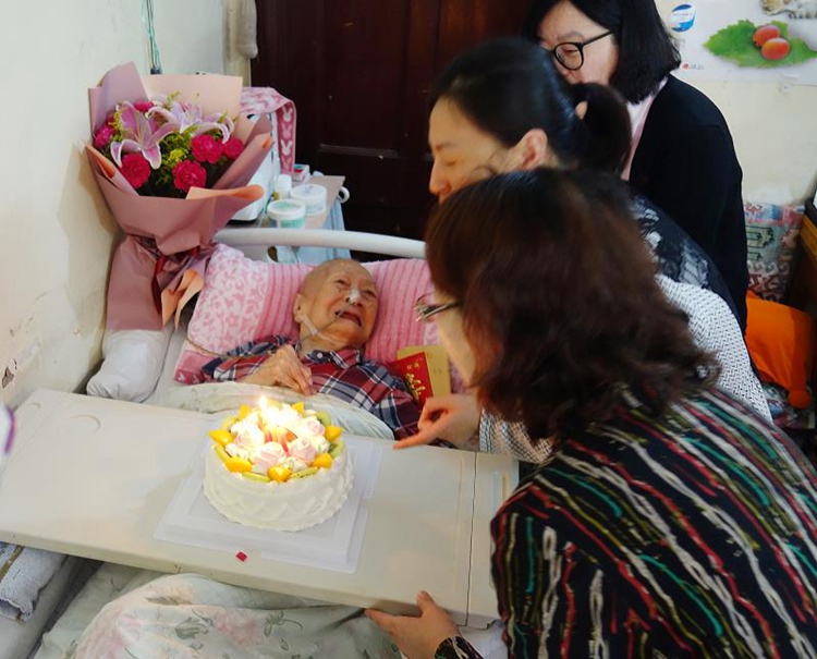 裴小倩代表校党委向黄老师送上鲜花和慰问金,她紧紧握住黄老师的双手,满怀感情地说道“祝您生日快乐,身体健康,每天都过得开心。今年是新中国成立70周年,感谢您为新中国建立做出的贡献,感谢您为国家的建设和改革以及学校事业的发展所做出的贡献。”裴小倩还细致地询问黄凛同志的饮食起居情况、身体状况。现场还和黄老师远在美国的女儿进行了视频连线;当“102”岁生日蜡烛点燃时,大家唱起了生日快乐歌,当年是女高音的黄凛老师虽然年事已高,声音不再那么高亢有力,但是她还是激动地一起哼唱,眼里闪烁着幸福的泪花,仿佛又回到了当年心爱的舞台。