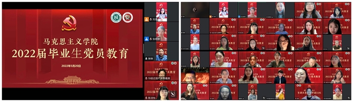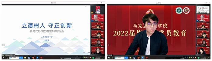 5月20日晚,马克思主义学院“青春向党 使命担当”——2022届毕业生党员教育活动在云端举行。学院积极利用校友资源,特邀上海市建平中学政治教师、学校发展中心副主任、2006级思想政治教育专业优秀校友刘宏福作为主讲嘉宾。马克思主义学院党委书记刘凤,院党委副书记、副院长孙琳,院党委组织员张婷婷、毕业班辅导员及2022届本研全体毕业生党员参加,活动由党委组织员张婷婷主持。