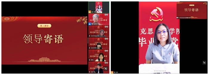马克思主义学院党委书记刘凤对疫情以来的学生党员志愿工作进行肯定,她表示疫情之下,在校学生党员们在做好自身管理的同时积极服务、奉献同学,以实际行动践行了入党誓词。最后,刘凤老师勉励毕业生党员们要厚植爱国情怀、家国情怀,厚植对马克思主义的信仰,立足现在,放眼未来,信心满怀地投身到新时代的伟大实践中,以青春之我奋力跑好历史的接力赛。
