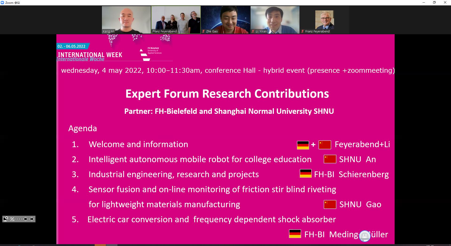 为了帮助德方师生更加全面地了解合作专业,比勒菲尔德应用技术大学Feyerabend教授和信机学院机械工程系主任李一染老师共同组织了《项目式教学的构想与实施》专场介绍,邀请曾参与过项目式教学的10位中德学生,对《汽车动力系统》课程中项目式教学的内容进行了线上展示;学院外事办公室副主任吴丽丽老师则对“汽车服务工程(中德合作)专业”做了更加全面的专场介绍。
