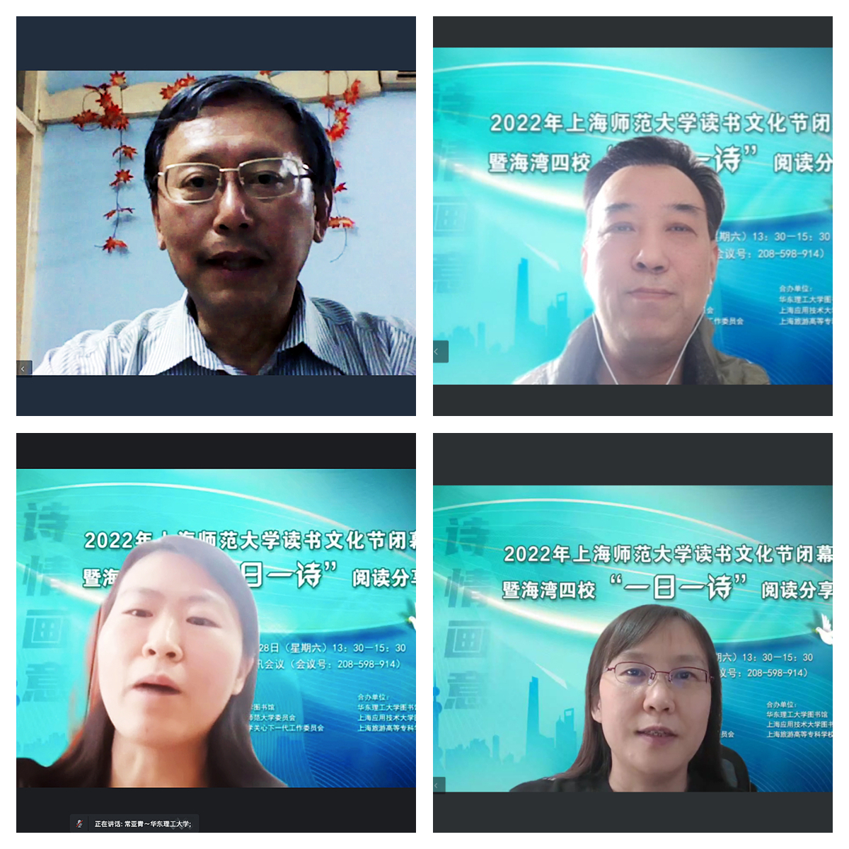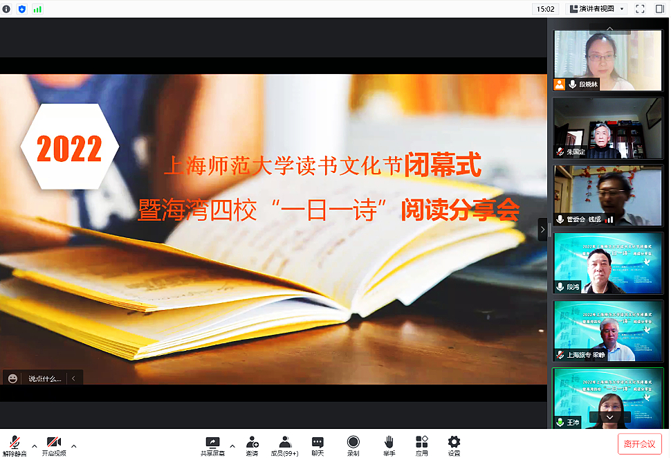 5月28日下午,“诗情画意 陪你抗疫”2022年上海师范大学读书文化节闭幕式暨海湾四校“一日一诗”阅读分享会在线上举行。校老教授协会副会长朱国定、奉贤校区管委会副主任钱成、图书馆党总支书记段鸿、关工委秘书长柏桦、团委副书记金黎琼、图书馆党总支副书记赵龙、图书馆副馆长王沛、段晓林,华东理工大学图书馆副馆长常亚青、上海应用技术大学图书馆副馆长刘静怡、上海旅游高等专科学校图书馆馆长梁峥,以及来自奉贤海湾四所高校的300余位师生参加活动。活动分开幕和阅读分享两个部分,由王沛和武云晟分别主持。