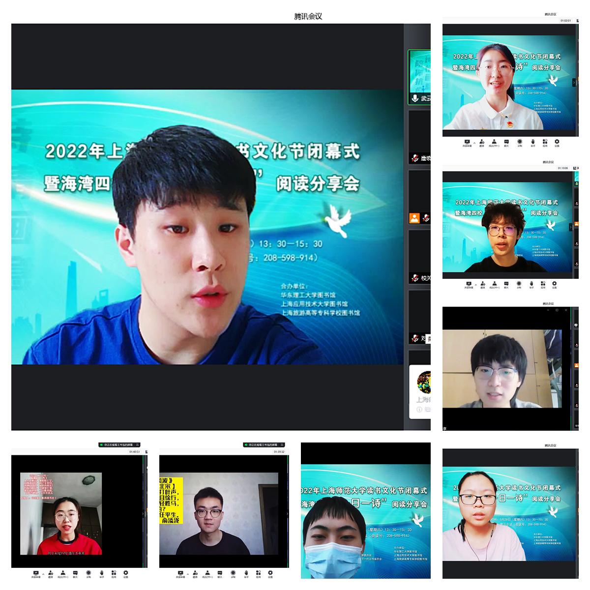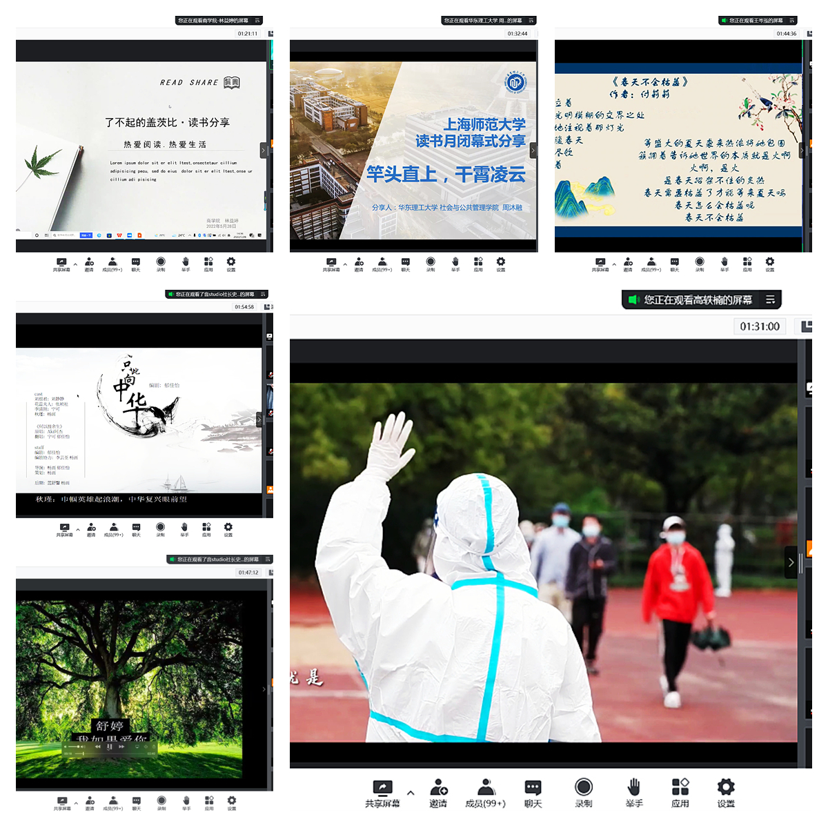 华东理工大学社会学院2018级的周沐融同学带来《竿头之上 干霄凌云》的分享,讲述阅读如何让她走进联合国的下设机构进行实习的励志故事。上海应用技术大学香料香精化妆品学部2019级俞添泷和外国语学院2020级章佳怡两位同学给我们呈现了阅读苏轼《定风波》和陶渊明《杂诗 其一》之后的感悟。上海旅游高等专科学校的甘田、付莉莉、俞子童等同学的诗歌原创作品、叶芊芊和薛莹莹同学的摄影和绘画作品整合成精美的视频进行展示,让人耳目一新。