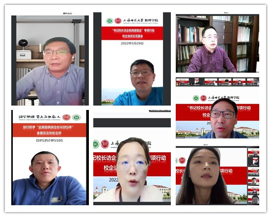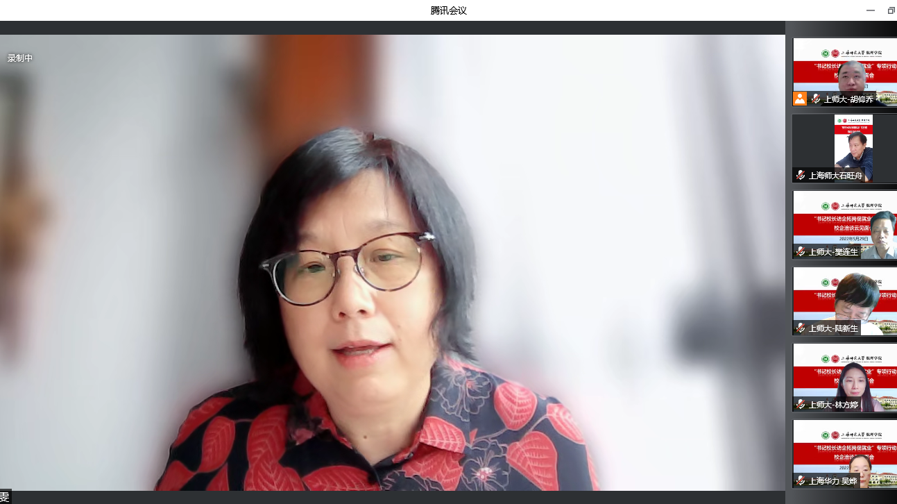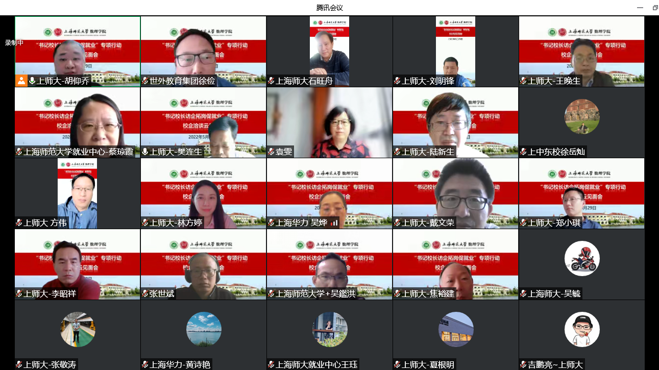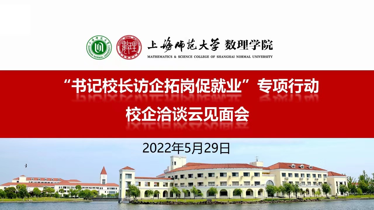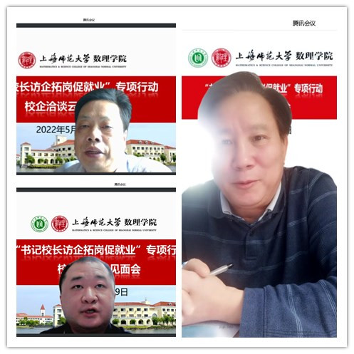 5月29日下午,为深入贯彻落实党中央、国务院关于“稳就业”、“促就业”决策 ,根据教育部、上海市教委有关通知的精神和要求,压实“百日冲刺”工作内容,全面深化校企合作、供需对接,上海师范大学“书记校长访企拓岗”专项行动数理学院专场顺利举行。本次活动采用了云见面会的形式开展校企洽谈。上海师范大学校长袁雯,上海均瑶世外教育科技(集团)有限公司总裁徐俭,华东师范大学第三附属中学校长干亚清,上海中学东校校长徐岳灿,闵行区莘松中学副校长张建国,上海华力集成电路制造有限公司人力资源部部长吴烨,杭州泰格医药科技股份有限公司招聘主管毛佳琪,兴业银行股份有限公司上海分行人力资源部副总经理王振宇应邀出席洽谈会。此外,校就业中心、数理学院全体党政班子成员、各系科主任、专业负责人、研究生导师代表、毕业班辅导员共同参会。