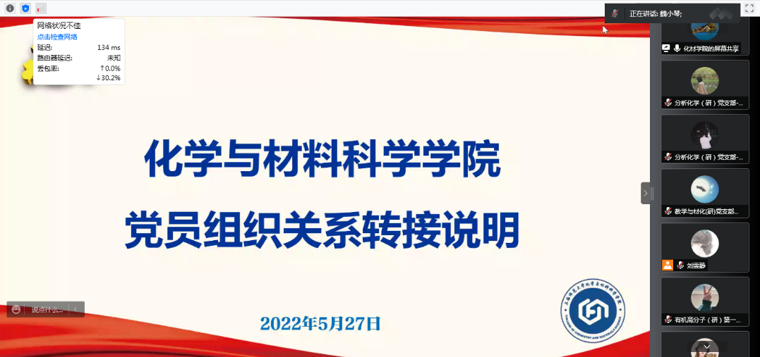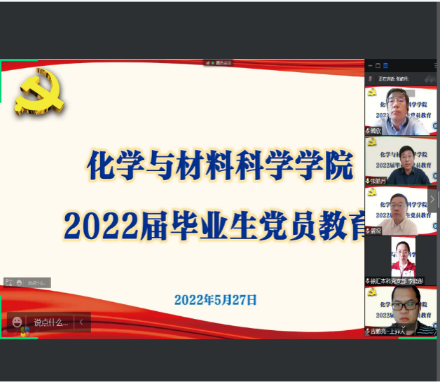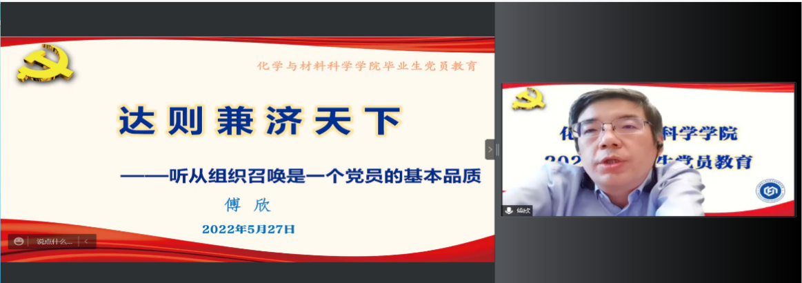 5月27日下午,化学与材料科学学院2022届毕业生党员教育活动在线上举行。学院党委邀请首批组团式教育援藏工作队队长、首批万人教育援藏工作队队长傅欣为学生党员上党课。学院党委书记盛况,院党委副书记副院长张皓月,院党委组织员刘雯静,毕业班辅导员,2022届本研全体毕业生党员参加活动,学院非毕业班学生党员列席活动。活动由张皓月老师主持。
