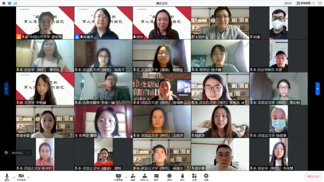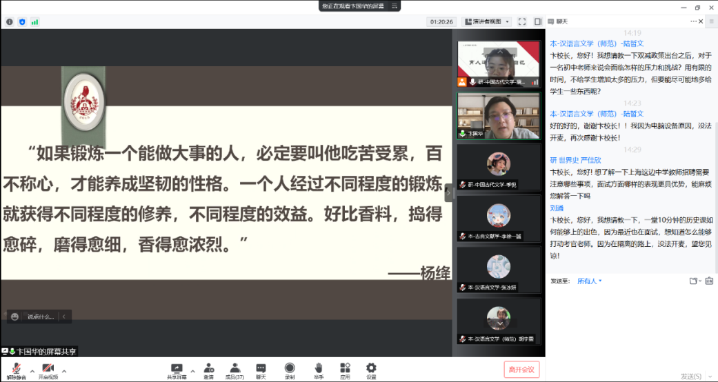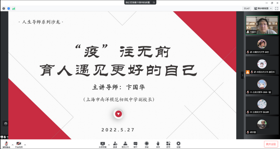 5月27日下午,人文学院邀请上海市南洋模范初级中学副校长、人文学院2009届历史学校友卞国华老师作为主讲嘉宾,以《“疫”往无前,育人遇见更好的自己》为题,作人生导师沙龙,向有志于投身教育事业的同学们讲述职业使命,诠释责任意识,剖析教育追求,直击教育真谛。近40本名研学生参加线上沙龙。沙龙由人文学院党委副书记、副院长陈重来主持。
