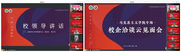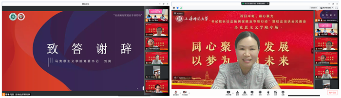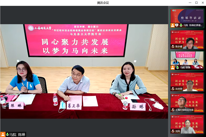为深入贯彻落实教育部《关于开展全国高校书记校长访企拓岗促就业专项行动的通知》相关要求,6月1日晚,马克思主义学院召开“书记校长访企拓岗促就业专项行动”暨校企洽谈云端见面会,并特邀上海市第二中学校长陆军,上海市园南中学校长史晓燕,上海市光明初级中学校长丁斌,上海建工二建集团纪委副书记、党建工作部主任沈世勋,交通运输部上海打捞局人事教育处处长花光泽、干部任沈震参与洽谈。校党委副书记、副校长葛卫华,校学生职业发展与就业指导中心蔡琼霞,学院全体党政班成员以及各学科、专业负责人出席会议。会议由毕业班辅导员陈琳主持。