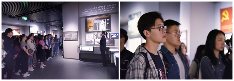 宣誓仪式结束后,党员同志们进入纪念馆参观。在讲解员的带领下,党员同志们沿着历史的轨迹,走进那段战火纷飞的岁月。其中,极具震撼力的《二十四烈士雕塑多媒体剧场》将高科技全息投影与舞蹈完美结合,让二十四烈士感人至深、可歌可泣的事迹变“活”了。当看到这群风华正茂的年轻人为了党的事业顽强拼搏,最终被敌人的镣铐和铁链送上刑场时,2019届本科毕业班党员柯婧同学不禁流下了难过的泪水:“这样一群年轻人,当他们面对死亡、走上刑场的时候仍然抬头挺胸,那是因为他们看到了一个光明的未来,他们的内心有着对中国共产党必胜、人民得到解放的信念,他们走向的不是死亡而是希望。”先烈们为革命事业献身的大无畏精神,践行共产主义的坚定不移的信念,将斗争进行到底的坚守与不屈,正鼓舞着新时代青年努力抒发爱国情,树立报国志,不忘初心,砥砺前行。