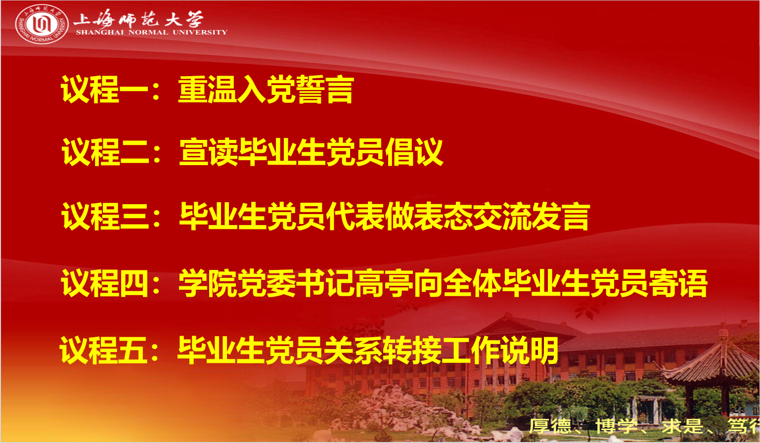 教育活动主要有重温入党誓言、宣读毕业生党员倡议、毕业生党员代表交流发言、组织关系转接说明、领导寄语等环节。全体毕业生党员在研究生辅导员苗华清同志领誓下宣读入党誓言。通过回望来路、回顾初心,深入体会入党时的誓言,凝聚更强大的精神力量。