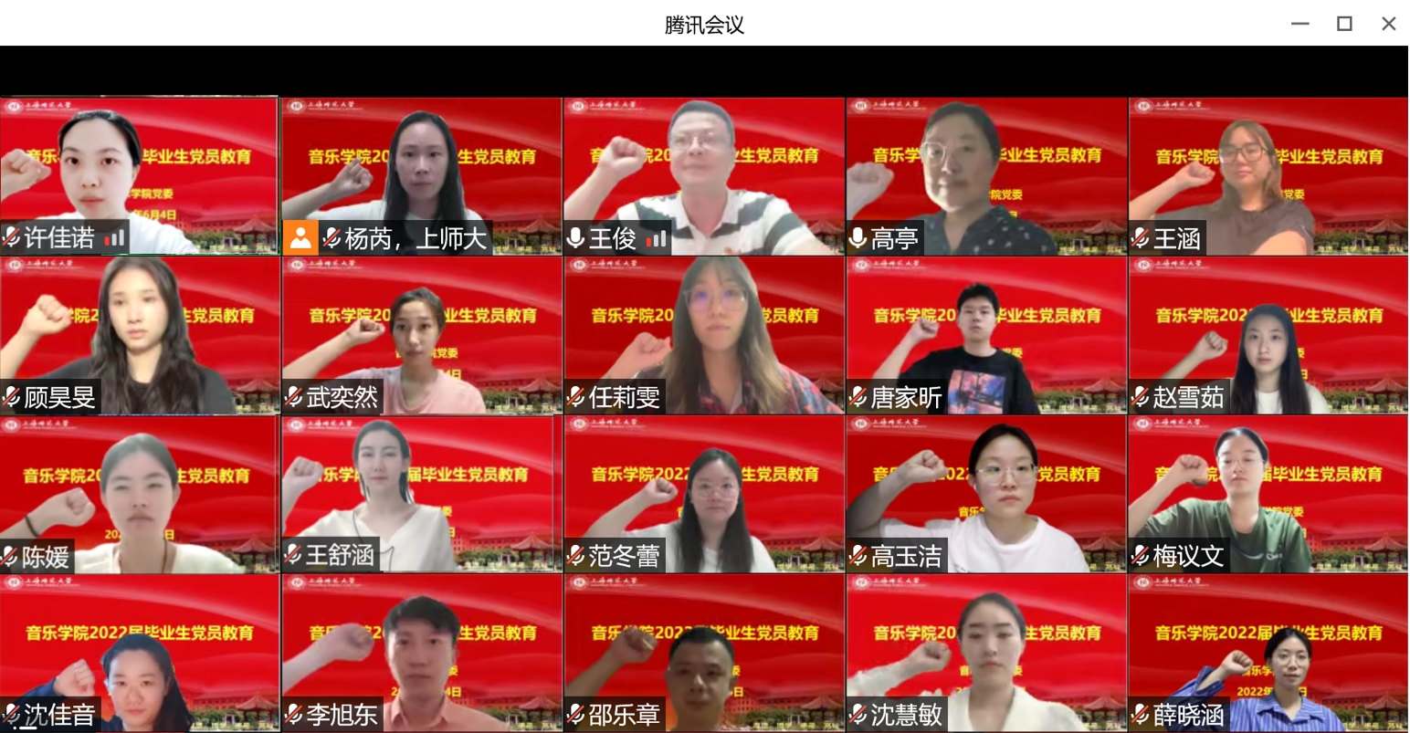 “回望来时路 启航新征程 喜迎二十大”——音乐学院2022届毕业生党员教育活动近日通过腾讯视频会议顺利举行。音乐学院党委书记高亭,院党委副书记兼副院长王俊,组织员俞莉娴,学工办主任、研究生辅导员苗华清,2018级本科生党支部书记、本科生毕业班辅导员杨芮及2022届本研毕业生党员参加活动。活动由王俊主持。