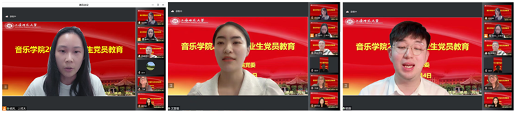 优秀毕业生党员代表2019级研究生党支部音乐专业杨振(签约上海大学市北附属中学)、2019级研究生党支部音乐专业杨贝诺(签约上海旅游高等专科学校)、2018级本科生党支部音乐学(师范)专业王徴弦(研究生支教团成员),2018级本科生党支部音乐学(师范)专业沈慧敏(签约上海海洋大学附属大团高级中学)做表态交流发言,通过分享学习经验、服务社会经历,展现了当代大学生勇于奉献、敢于担当的责任意识。毕业生党员同志纷纷表示,要把个人的命运与祖国、人民的利益紧密联系在一起,为祖国的发展贡献自己的力量。