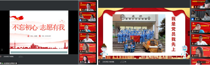 研究生党员张茜茜和本科生党员陆佳颖交流疫情期间的志愿经历,与很多学生党员一样,她们都积极投身于志愿服务工作。张茜茜以“不忘初心、志愿有我”为主题分享了她在师大校园作为一名志愿者的所做、所想与所感。陆佳颖以“青年勇担当、战疫有力量”为主题分享了她在南桥镇社区担任志愿者的经历。两位学生党员都在疫情防控中贡献了大学生党员应有的力量,展现了新时代青年的风采。