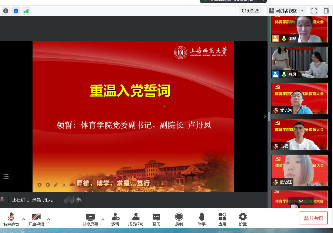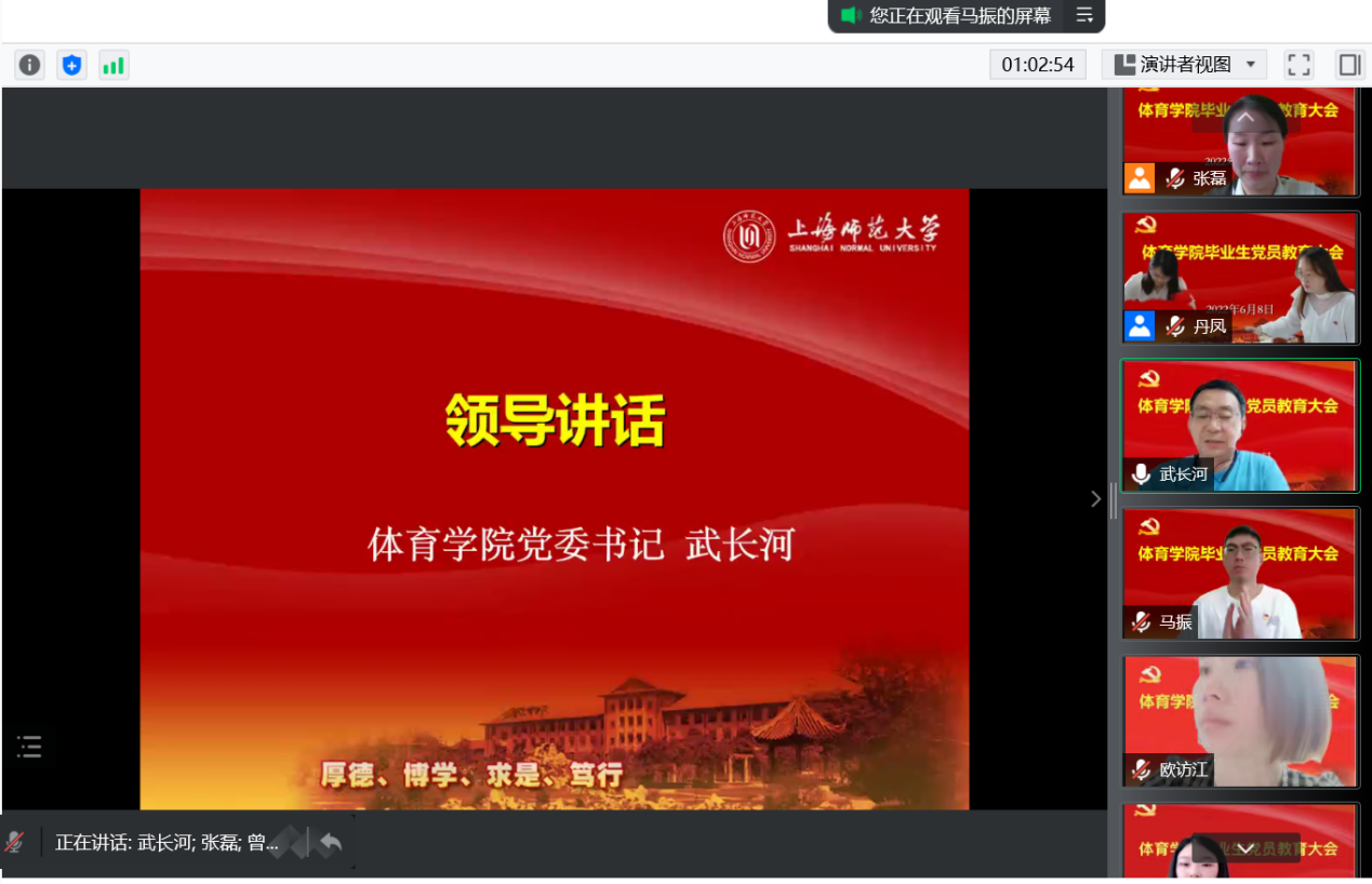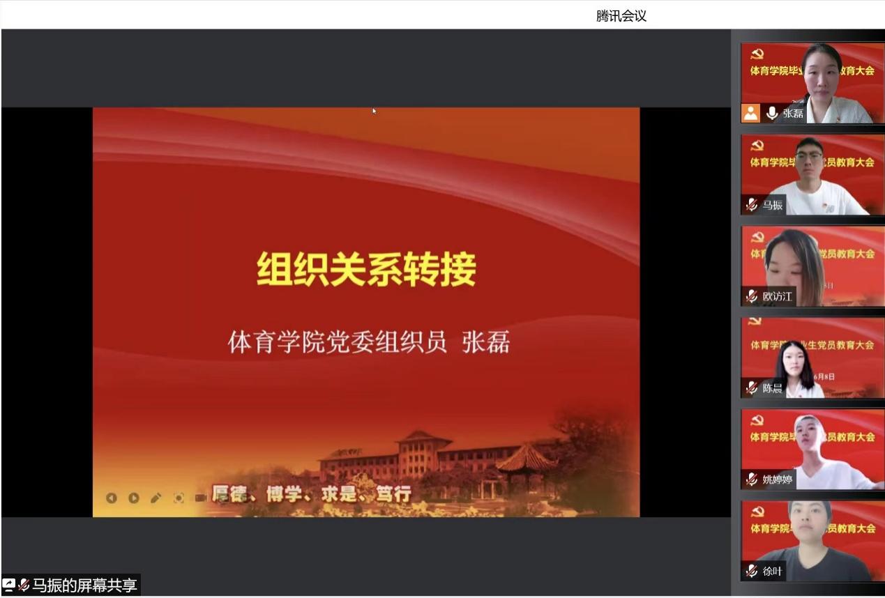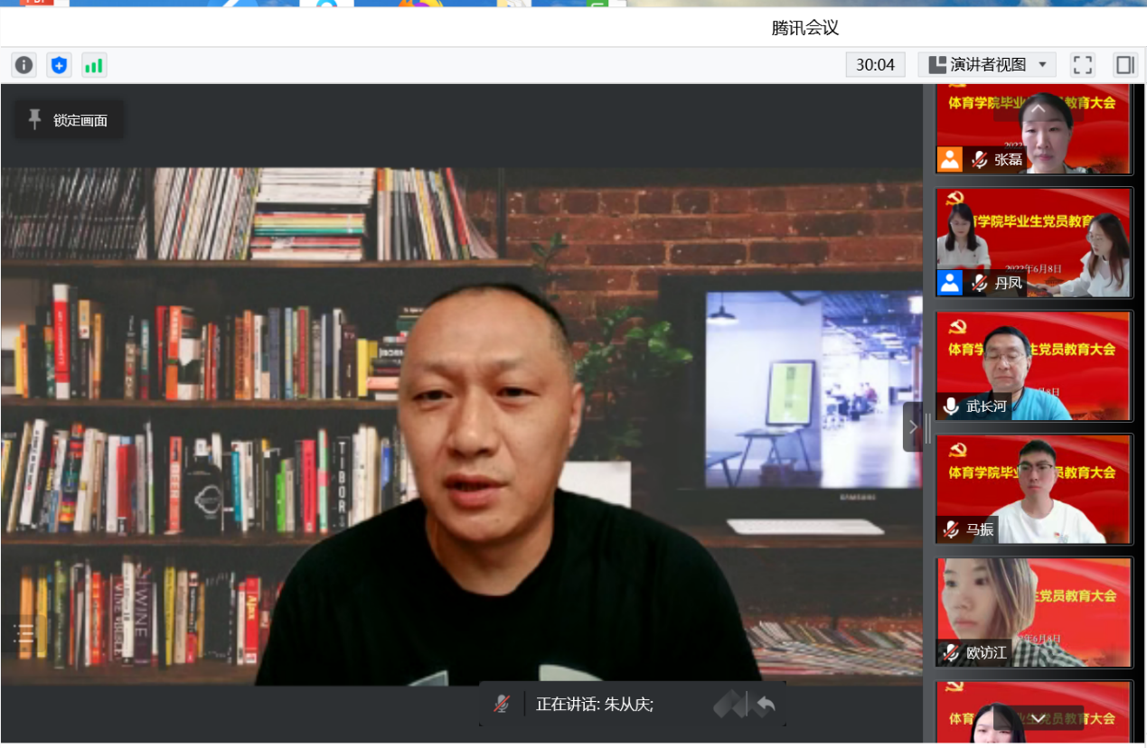 为进一步加强毕业生党员理想信念及宗旨意识,6月8日上午,体育学院在云端举行了2022届毕业生党员集中教育活动。学院党委书记武长河,党委副书记、副院长卢丹凤,球类田径教工党支部书记朱从庆,毕业班辅导员以及2022届毕业生党员出席本次活动。活动由党委组织员张磊主持。