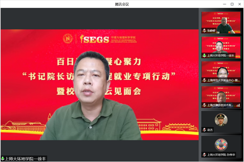 为深刻把握就业工作面临的新形势新任务,帮助毕业生们更加充分更高质量就业,6月21日上午,上海师范大学“书记校长访企拓岗促就业”专项行动环境与地理科学学院专场通过腾讯会议举行。我校副校长张峥嵘、上海市闵行区教育党工委副书记兼教育局局长何美龙、上海市陆行中学北校校长兼书记胡铮、中广核达胜科技有限公司董事长周月东、中广核达胜科技有限公司副总经理吴洪、中广核达胜科技有限公司研发设计部经理陈川红、上海地听信息科技有限公司总经理张伟锋、上海杰狮信息技术有限公司总经理顾登生、智纲智库副总经理黄栋出席洽谈会。此外,校就业中心主任蔡琼霞,学院党政班子成员及2022届和2023届毕业班辅导员共同参会。会议由环境与地理科学学院党委副书记、副院长张红主持。
