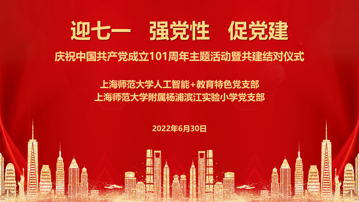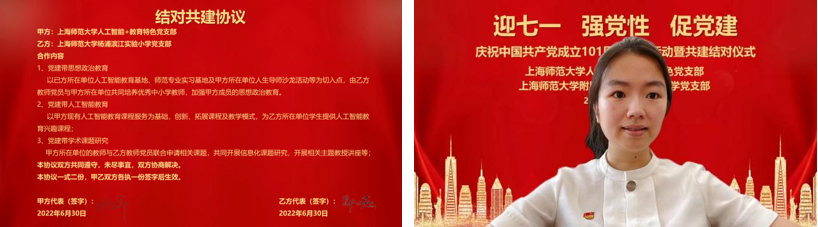 6月30日下午,信息与机电工程学院人工智能+教育特色党支部与上海师范大学附属杨浦滨江实验小学党支部全体成员齐聚云端,联合开展庆祝中国共产党成立101周年主题活动暨共建结对仪式。信息与机电工程学院党委副书记、副院长何佳,上海师范大学附属杨浦滨江实验小学党支部书记、校长郑小燕,市委组织部《组织人事报》采编中心副主任蒋捷舟,杨浦区教育工作党委党校常务副校长、杨浦区教育学院教育管理培训部主任许坚应邀出席。双方党支部全体党员与入党积极分子参会,活动由人工智能+教育特色党支部副书记卢淑怡主持。