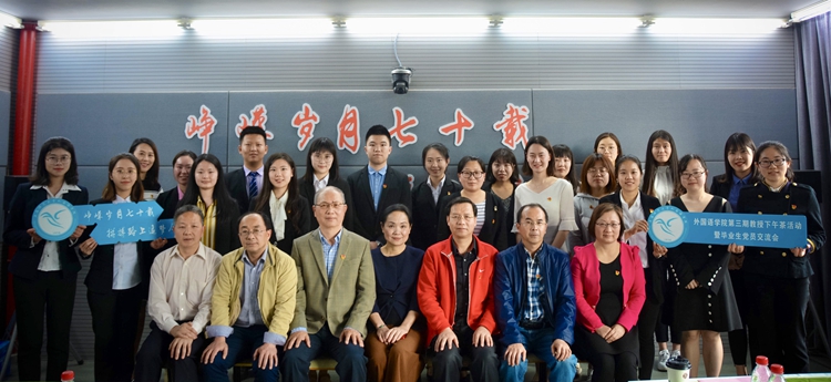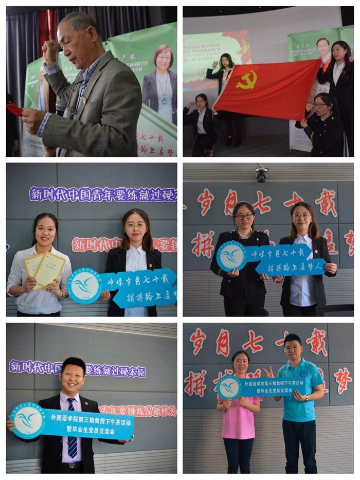 一个典型就是一面旗帜,一个模范就是一座丰碑。外国语学院党委深知优秀党员的模范典型作用,力求通过身边人讲身边事、用身边事教育身边人。5月10日下午,召开了以 “峥嵘岁月七十载·拼搏路上追梦人”为主题的第三期教授下午茶暨毕业生党员交流会。活动特邀优秀校友、院关工委老同志以及学院的教授们为本研毕业班党员讲述青春故事,分享心路历程。受邀请的校友吕乐教授在她的“与国同梦·我的教育人生”主题发言中指出,当代青年生逢强国时代,肩负强国使命,要做祖国伟大复兴的见证者、经历者和参与者。老同志带领毕业班党员重温了入党誓词,回归初心,坚定信念,牢记使命,奋勇前进。专业教授每人都送上美好祝福和殷殷期盼,谈书中学涯百味,悟时代青年责任。交流会过半,教授与学生们共享下午茶,在轻松愉悦的氛围中共话师生情,并在赠书上留下墨宝,为青春留下美好的印记。