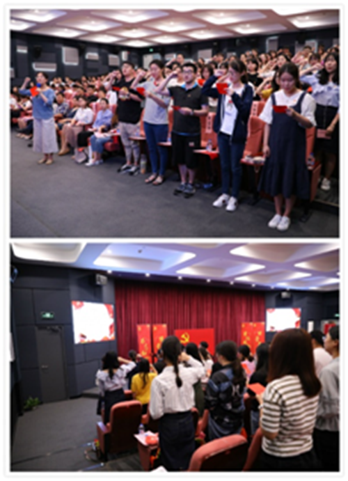 在庄严的会场中,姚霏带领学院2019年新发展的预备党员进行入党宣誓。铮铮誓言响彻耳边,热血激情澎湃心间,预备党员们难掩激动的心情。2017级现当代文学刘灵表示,宣誓的那一刻,报出的是宣誓人不同的名字,看到的是一样年轻坚毅的面庞,感受到的是同样忠贞的誓言——“在勇敢前行的路上,时刻努力怀揣着有温度的初心,才能让我们的青春在奉献中闪光。”2017级中国古典文献学毛蔚琳说到,今后将始终把入党誓词放在心间,充分发挥学生党员先锋模范作用,为党和人民贡献力量。2018级学科历史岳增帅谈到,作为中国共产党党组织中年轻的一员,在发出誓言的那一刻,自己早已决定为实现共产主义事业奋斗终身。2016级汉语言文学师范世承班尹伊人表示,自己将会把铿锵有力的誓言,化为激励与鞭策,从一点一滴做起,以一言一行证明。2016级广告学2班钱晓悦说到,宣誓的那一刻,红色的精神在我血液中流淌,宣告着我拉开了新生活的篇章。新时代赋予了我新使命,我必将不忘初心,砥砺前行。