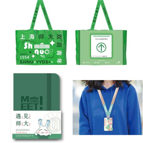 2022上海师大“迎新礼”主要体现了上海师大的标志性建筑和校园风景,结合专属的“师大绿”色彩,预示着新生步入大学新的开始和新的希望。将口罩和行程码等元素融入设计之中,用更亲切的方式强调校园防疫的重要性。