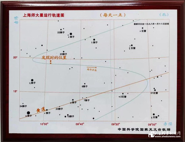 据介绍,该小行星为中国科学院国家天文台施密特CCD小行星项目组于1998年1月18日发现,轨道介于火星与木星之间的小行星主带上。该星绕太阳一圈,地球绕太阳四圈,也就是上海师大星上的一年相当于地球上的四年,恰合学校本科教育人才培养的周期。