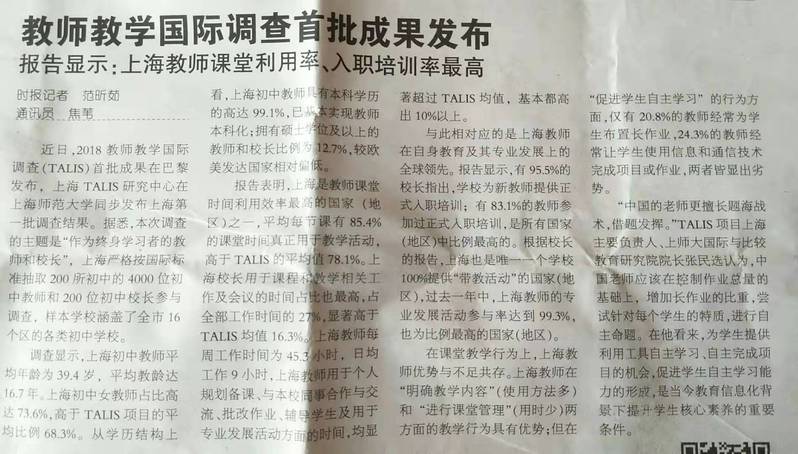 标题:教师教学国际调查首批成果发布——报告显示:上海教师课堂利用率、入职培训率最高