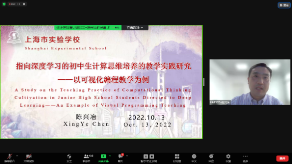 问题化学习模块后,上海市实验学校副校长陈兴冶以一项科学严谨的教育研究为例,向与会者展示指向深度学习的可视化编程教学可以更有效地促进学生高阶思维发展。之后,实验学校马颖莹老师以中学八年级的一节精心设计的信息技术课为例,展示如何以可视化编程提升学生高阶思维。