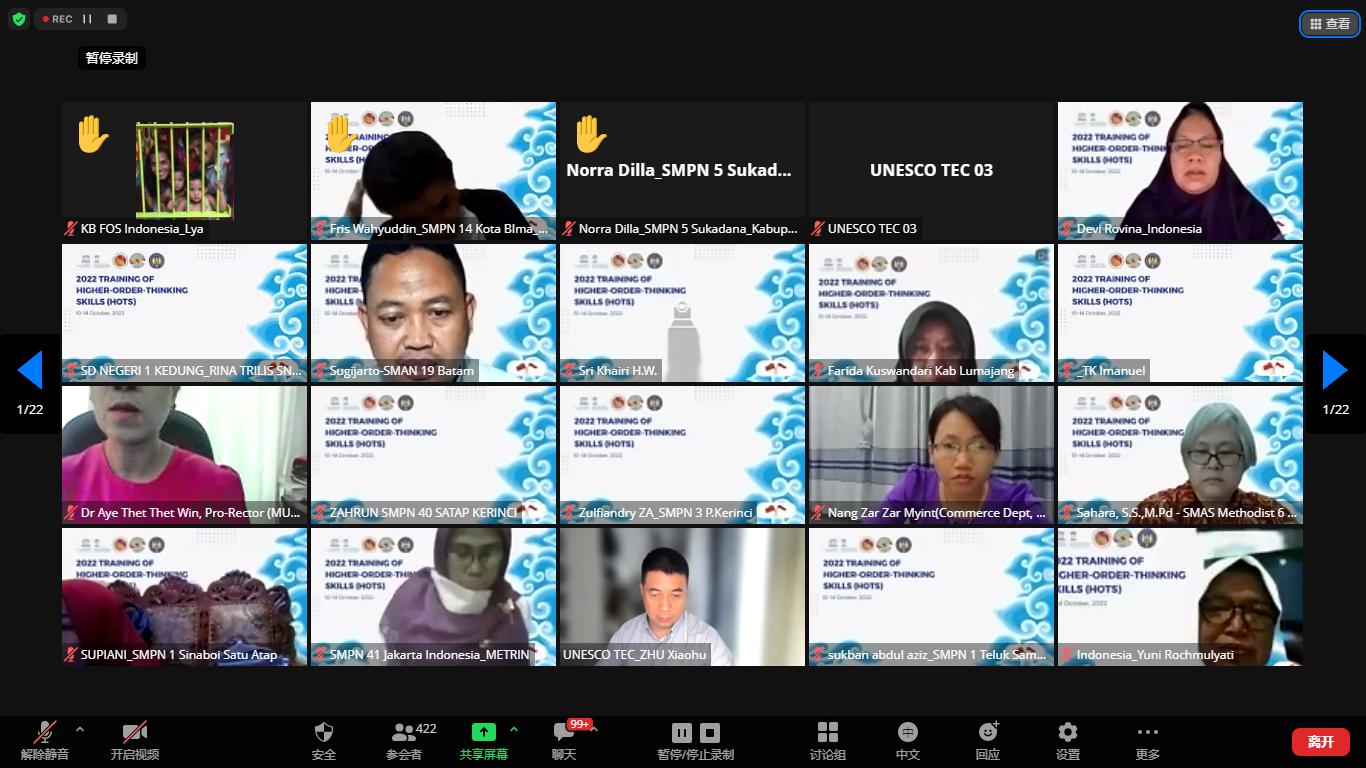 朱小虎副教授总结了此次培训的内容,对培训专家、公开课授课教师和学生以及参与线上培训的东盟各国教师表示衷心的感谢。针对与会者对于高阶思维培育的强烈合作愿望,朱小虎副教授提议建立“UNESCO-TEC高阶思维发展联盟”,增进各国在高阶思维研究、课程设计、教学策略、测评发展和技术支持上的合作,该倡议得到与会者热烈响应。
