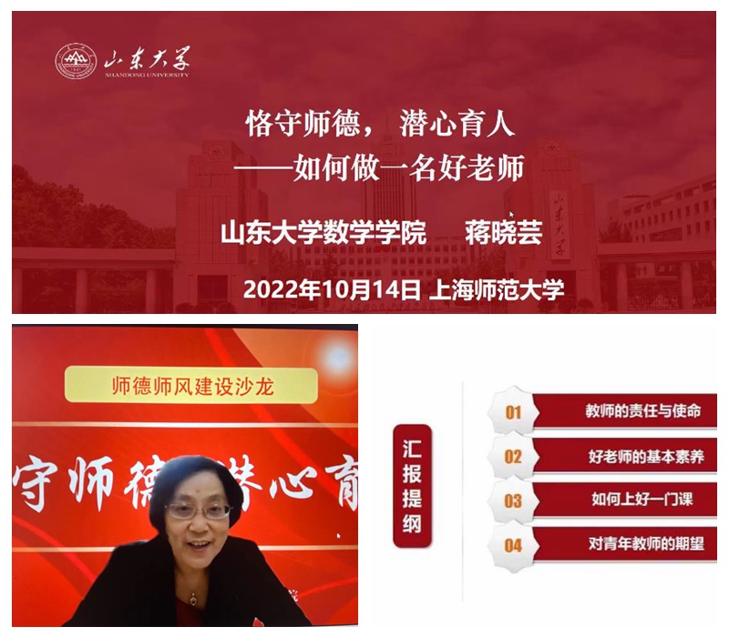 10月14日下午,数理学院党委组织学院青年教师联谊会举办了“师德师风建设沙龙”活动。活动邀请国家教学名师、全国五一巾帼标兵、山东大学数学学院博士生导师蒋晓云教授在线上作了题为“恪守师德,潜心育人”的报告,学院党委书记樊连生、副院长王晚生、副院长郭谦及学院80余名青年教师和70多位教育类本、研学生参加了会议,学院青联会会长郭玲教授主持会议。