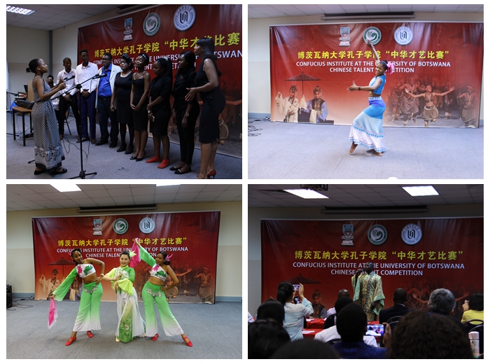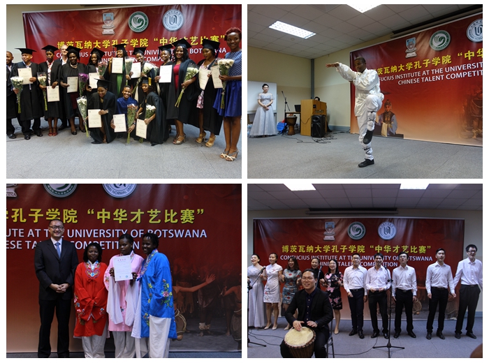 12月4日晚,我校与博茨瓦纳大学合办的博茨瓦纳大学孔子学院成功举办了“中华才艺比赛”。该校人文学院院长Andy Chebanne、副院长Peter Sebina、中国驻博茨瓦纳大使馆政治部主任汤沈洴、孔子学院外方院长Part Mgadla、中方院长董建萍出席。