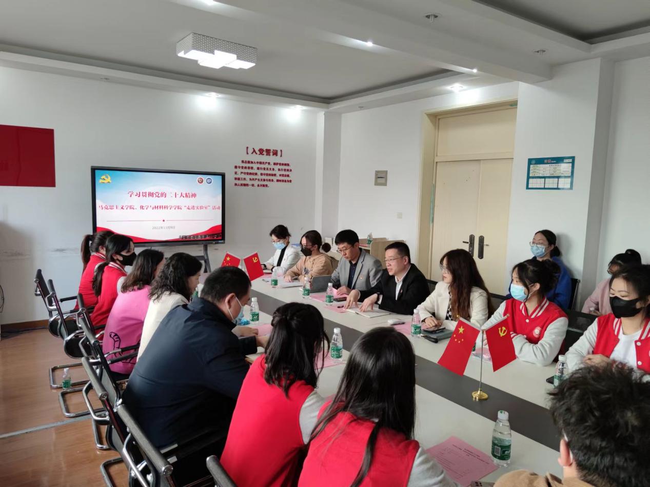 为学习贯彻党的二十大精神,促进文理学生交流交融,进一步创新理论学习形式,马克思主义学院、化学与材料科学学院联合举办学习贯彻党的二十大精神暨“走进实验室”活动。化材学院化学教工第二党支部教师代表、首届应用化学拔尖班学生代表和马院思政课教师代表、马克思主义学生理论宣讲团党支部成员以及两个学院党委相关负责同志参加活动。