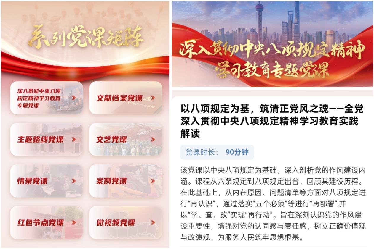 本轮“系列党课矩阵”由上海市委组织部统筹打造,整合市区优质资源,共设深入贯彻中央八项规定精神学习教育专题党课、文献档案党课、主题路线党课、文艺党课、情景党课、案例党课、红色节点党课、微视频党课等8类课程,旨在推动党的创新理论深入基层、落地生根。