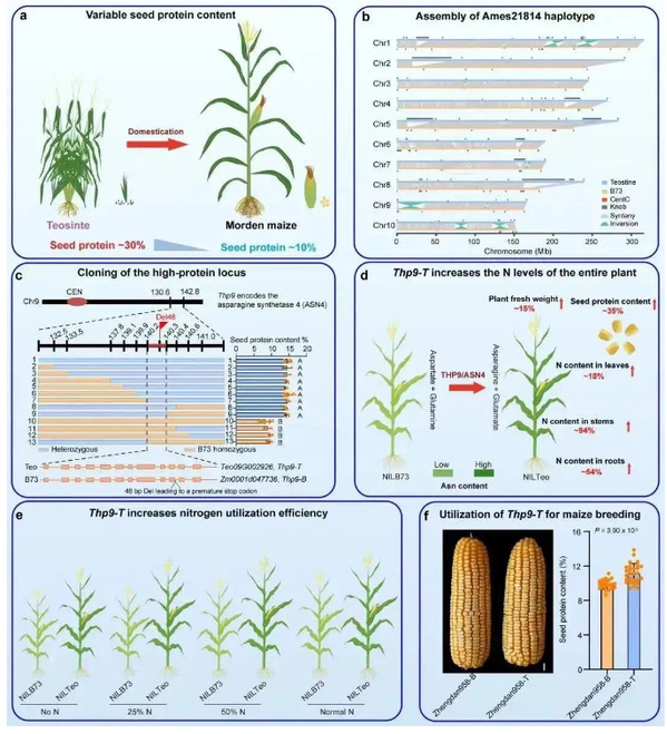 “THP9负责合成的酶,负责合成天冬酰胺,而天冬酰胺是植物合成蛋白质的重要基础原料。”巫永睿介绍,现代玉米中THP9的突变形式THP9-B导致合成天冬酰胺的功能变弱,“我们将野生玉米中的THP9-T引入现代玉米后,种子中的蛋白质含量增加了约35%,根、茎、叶中的氮含量分别增加了54%、94%、18%左右”。