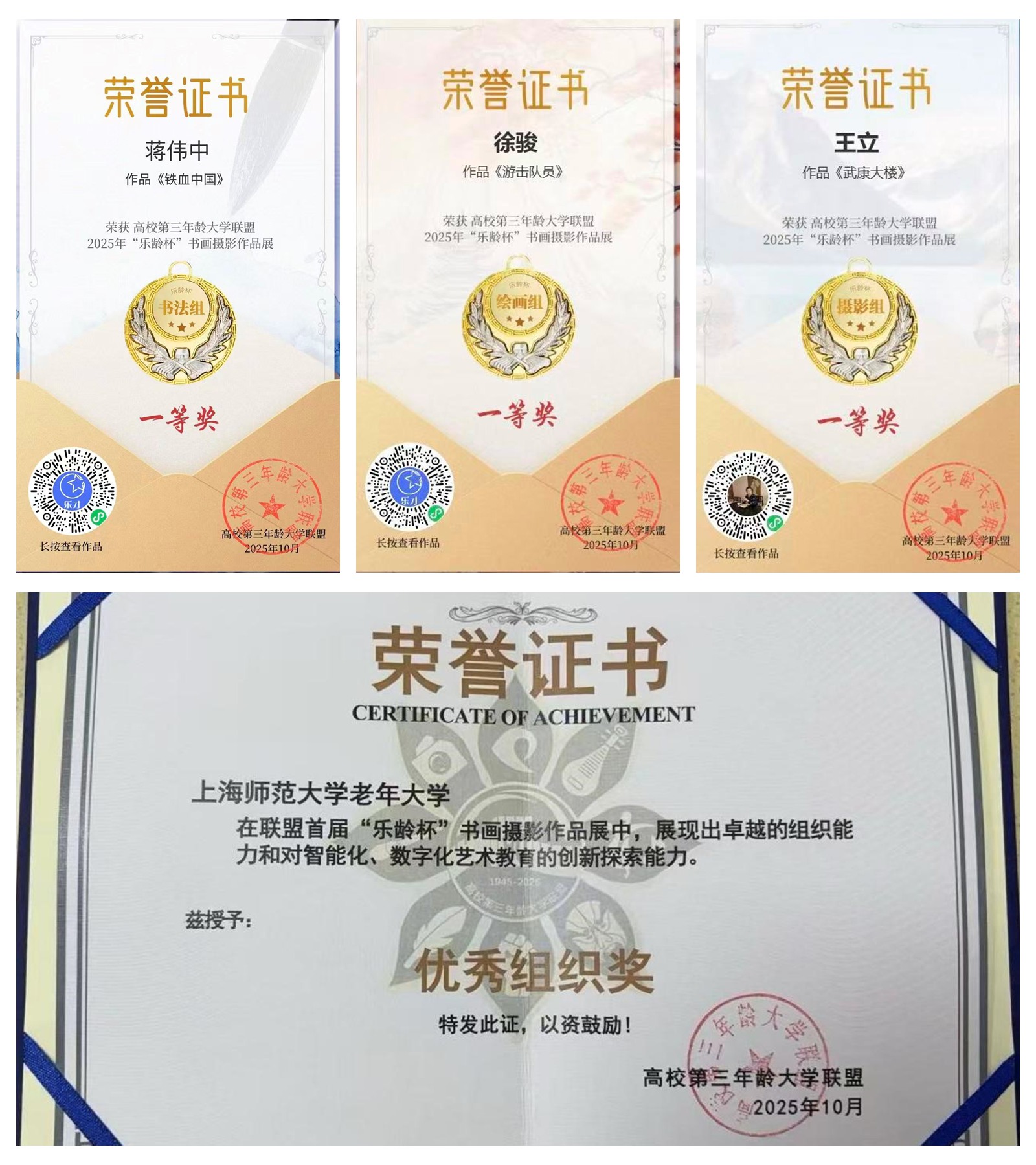 我校老年大学学员蒋伟中的“铁血中国”、贾巍“毛主席诗词”、张兴“春归兰映联”获书法组一等奖,另有三人获二等奖、五人获三等奖。朱曙光“民族脊梁”、徐骏“游击队员”、徐丙申“昭陵六骏”获绘画组一等奖,另有三人获二等奖、五人获三等奖。王立“武康大楼”、徐骏“不屈”获摄影组一等奖,另有三人获二等奖、五人获三等奖。